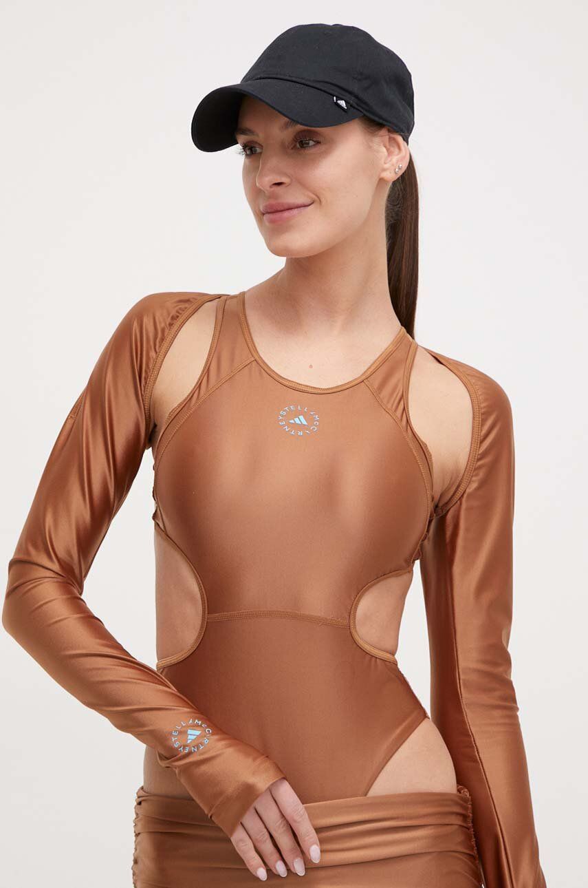 adidas by Stella McCartney body femei, culoarea bej IN3660. Body din colectia adidas by Stella McCartney. Model confectionat din tesatura subtire, elastica. – Produsul contine materiale realizate din fibre reciclate. – Model montat cu croiala corporala. – Maneca lunga. – Decolteu rotund. – Material tricot flexibil si subtire. – Latimea la subrat: 35 cm. – Lungimea: 67 cm. – Dimensiunile date pentru marimea: