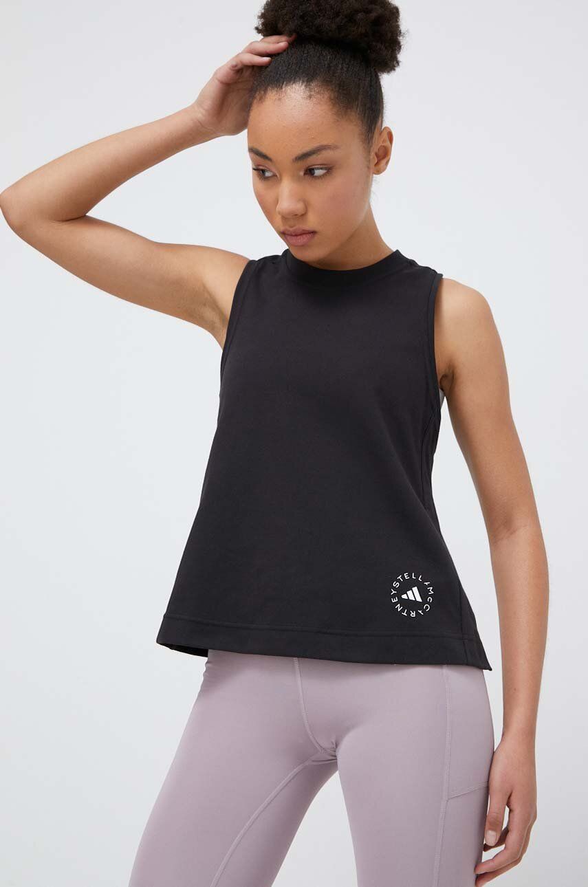 adidas by Stella McCartney top femei, culoarea negru IB6857. Top din colectia adidas by Stella McCartney. Model confectionat din material cu un continut ridicat de bumbac. – Produsul contine materiale realizate din fibre reciclate. – Produsul contine fibre de bumbac organic crescute fara utilizarea de substante chimice periculoase pentru sanatate, pesticide chimice sau ingrasaminte artificiale. – Modelul este conf