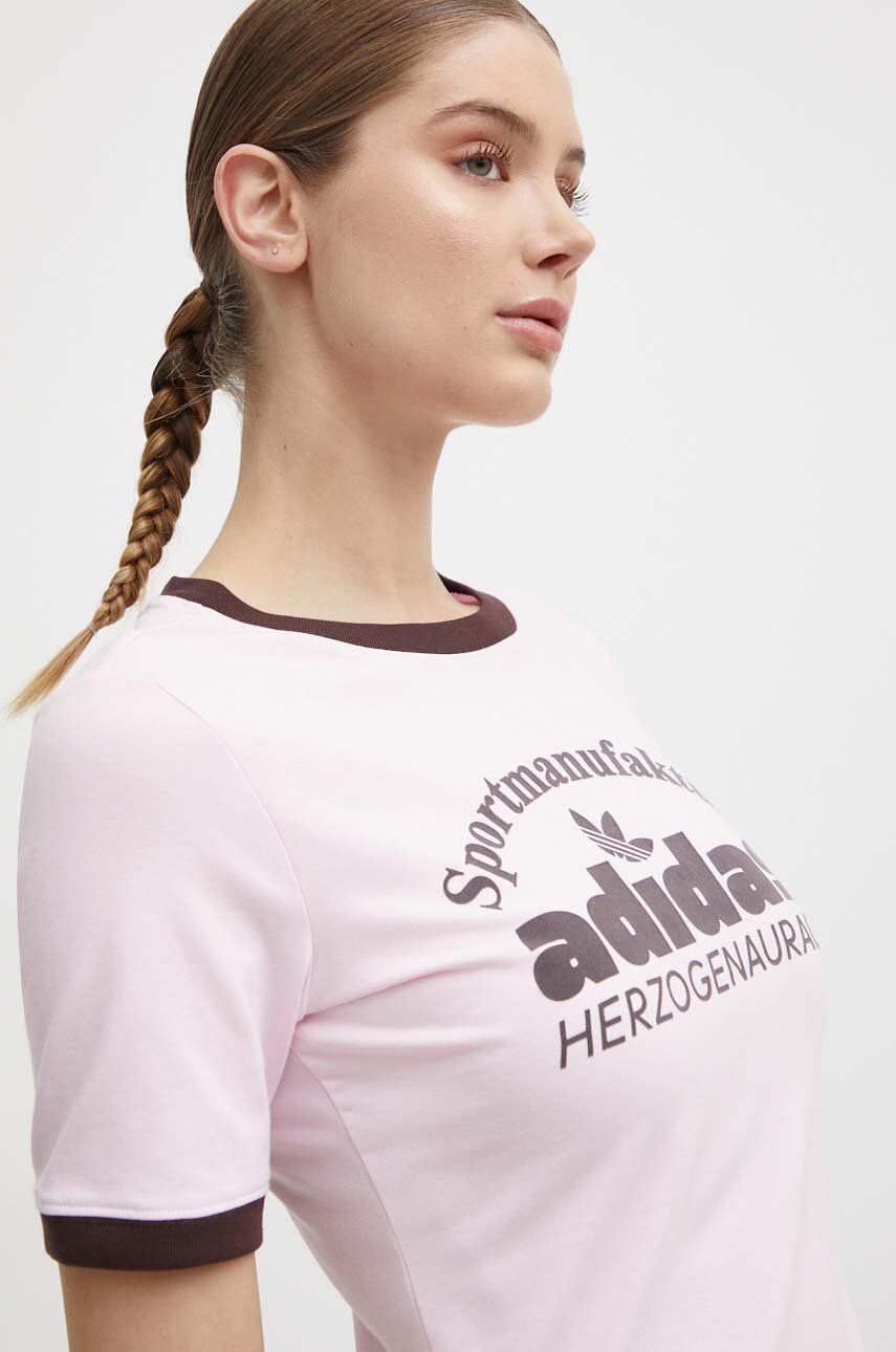 adidas Originals tricou femei, culoarea roz, IR6087. Tricou din colectia adidas Originals confectionat din tricot cu imprimeu. Model realizat din material extrem de confortabil cu un continut ridicat de bumbac. – Taiere simpla, fara blocare. – Decolteu clasic, rotund. – Material tricot flexibil si subtire. – Lungimea: 55 cm. – Latimea la subrat: 42 cm. – Dimensiunile date pentru marimea: S.