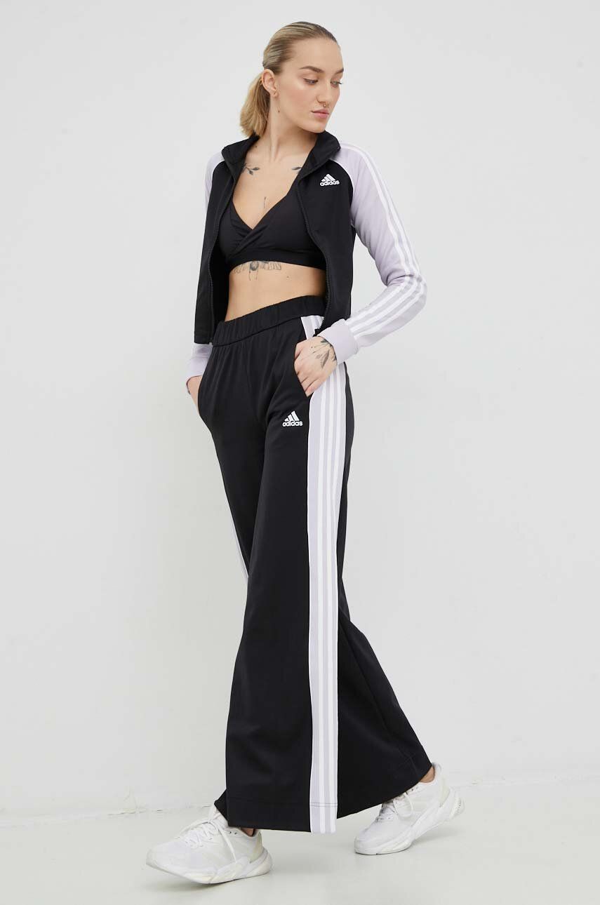 adidas trening Femei, culoarea negru. Compleu de trening din colectia adidas. Model confectionat din tricot confortabil. – Acest produs provine din linia de produse Adidas End Plastic Waste, fabricate din materiale reciclate. – Fason slim fit. – Incheiere cu fermoar. – Guler ridicat. – M??neci finisate cu o coada elastica confortabila. – Elastic in talie cu snururi. – Do
