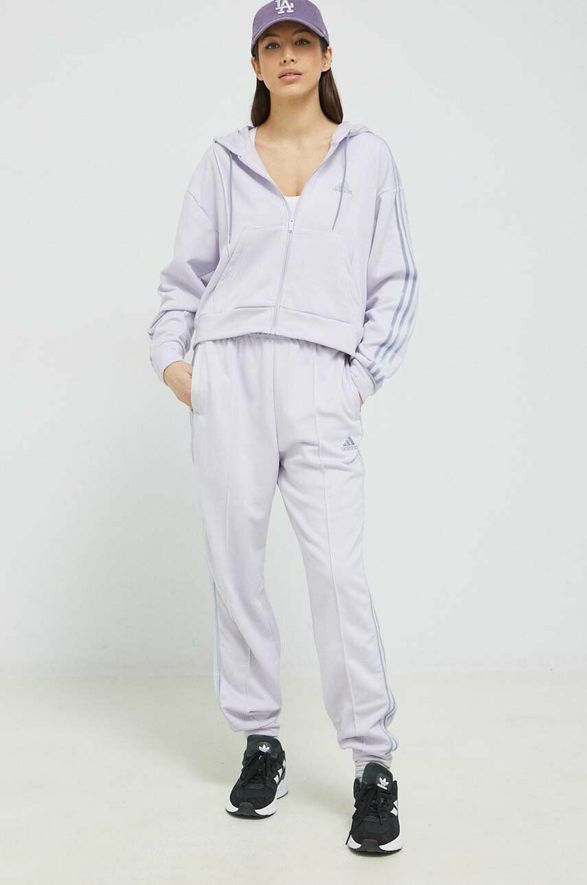 adidas trening femei, culoarea violet. Compleu de trening din colectia adidas. Model confectionat din tricot subaire, elastic. Material foarte confortabil. – Acest produs este realizat partial din poliester reciclat. – Potrivire lejera. – Maneca lunga. – Linia umerilor lasata. – Gluga stransa cu snururi. – Buzunare oblice. – Finisaj din manseta. – Cu dungi laterale. – Cusaturi decorative. – Talie ??nalta c