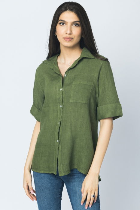 Camasa clasica din in cu buzunar pe piept si maneca 3 4, kaki