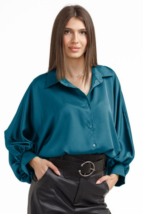 Camasa eleganta din satin, cu maneci bufante, turcoaz inchis