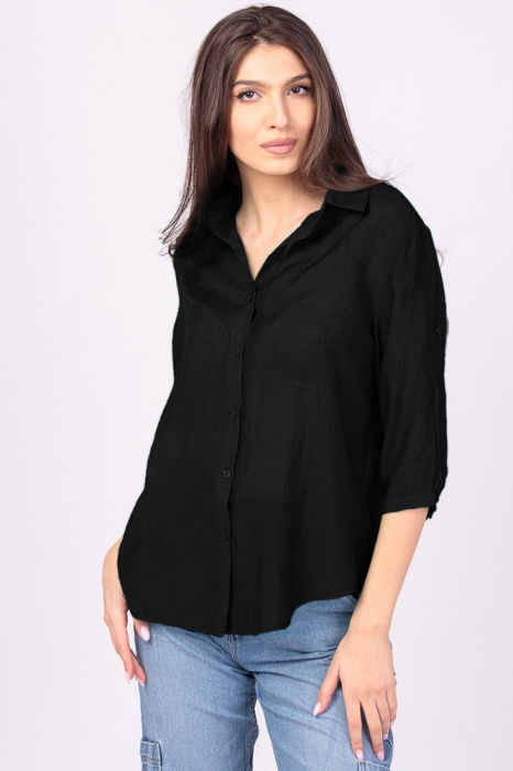 Camasa subtire, neagra, cu guler clasic, maneca lunga si buzunar pe piept.Guler clasic Se inchide cu nasturi pe fata de sus pana jos Maneca lunga cu manseta ce se inchide cu nasture si se poate ridica si inchide cu alt nasture Material: 100% rayon Decriere dimensiuni: S: umeri 38 cm, bust 100 cm, lungime 65 cm M: umeri…