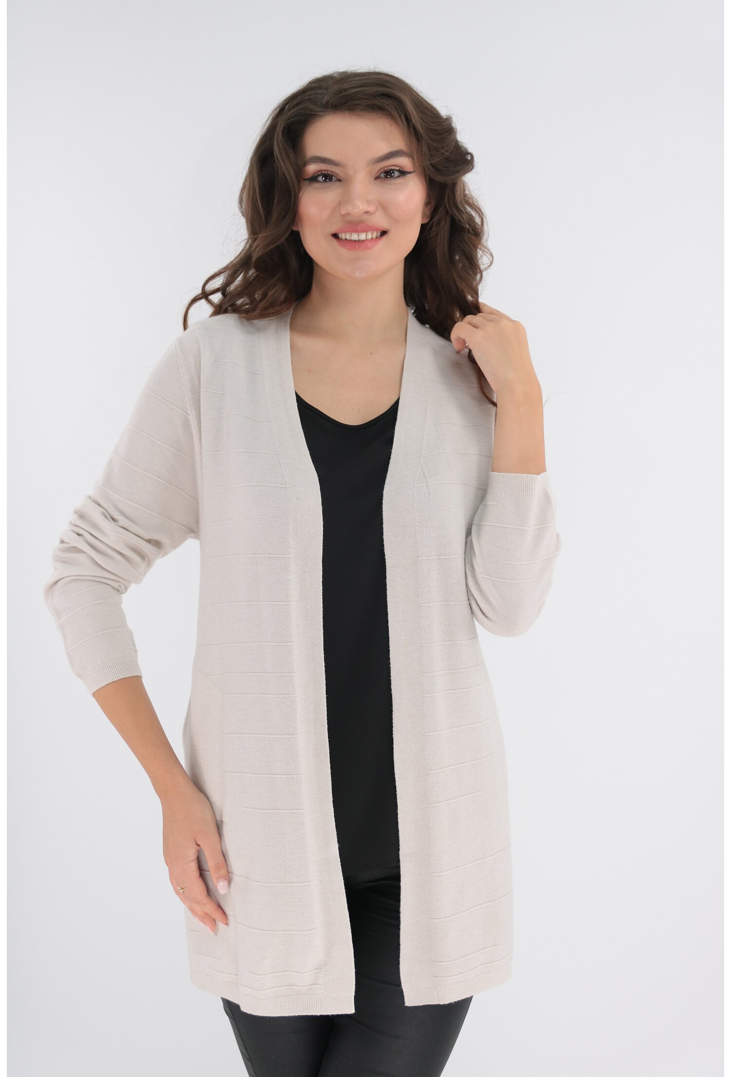 Cardigan crem cu buzunare ascunse si model discret 3D. Cardigan crem cu buzunare ascunse si model discret 3D Material placut la atingere, moale si confortabil Maneci lungi Buzunare laterale functionale MATERIAL: 25% Casmir, 5% Lana, 60% Bumbac, 10% Elastan LUNGIME: 80 cm la marimea M/L ; 83 cm la marime