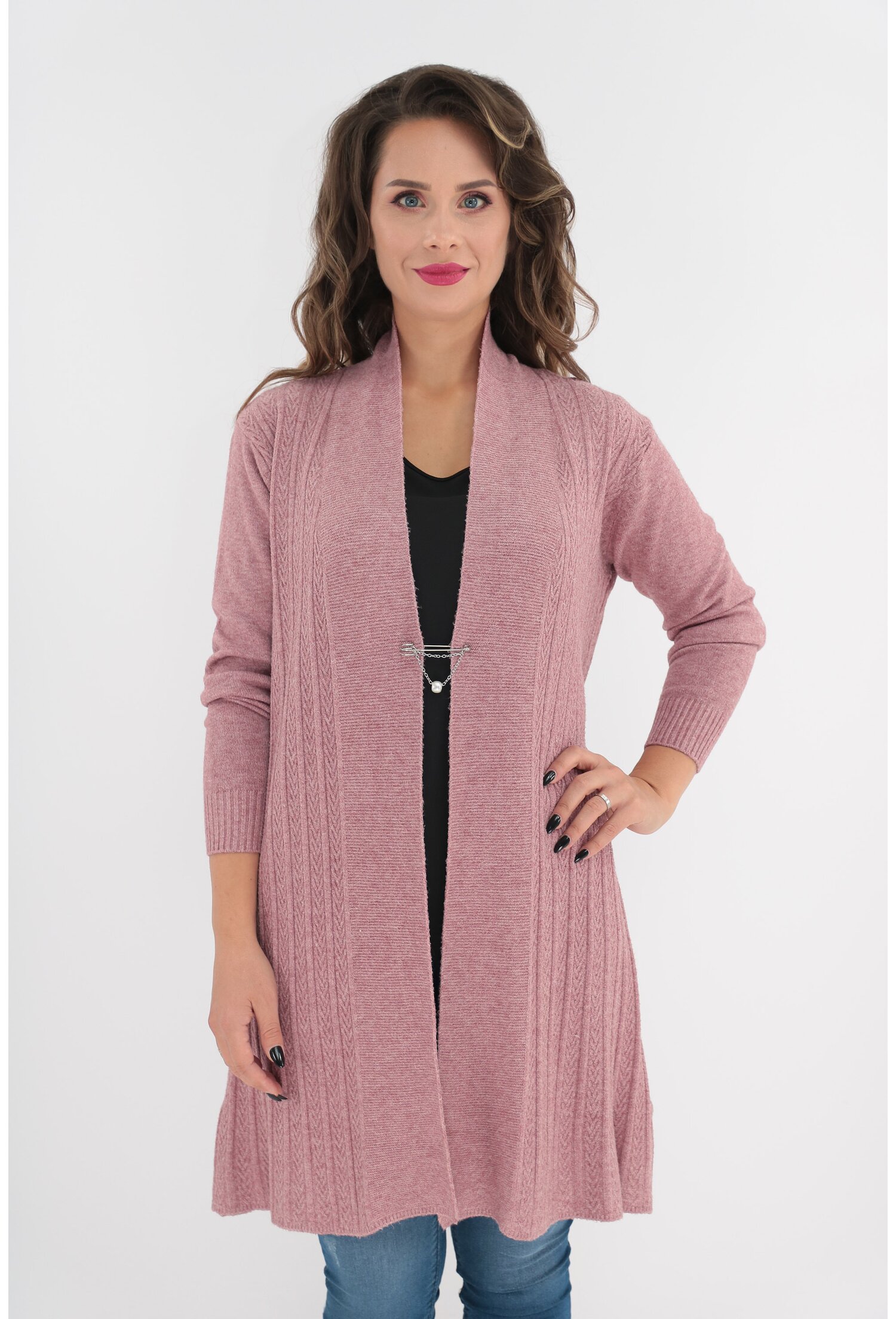 Cardigan roz-prafuit tricotat model spic. Cardigan rozprafuit tricotat model spic, lung Maneci lungi Inchidere cu brosa argintie MATERIAL: 70% Acryl, 30% Vascoza LUNGIME: 90 cm la marimea XL/XXL