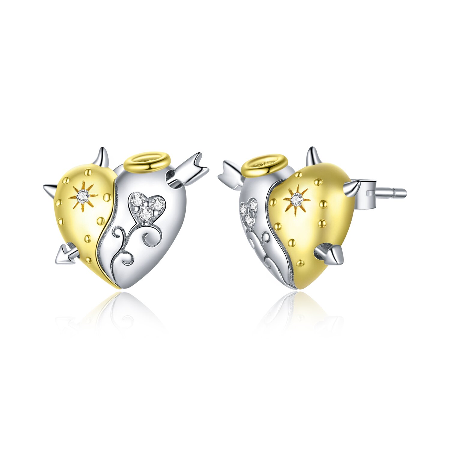 Cercei din argint Angel and Demon Heart. Mărimi Material: Argint 925 Placaj: Aur 14K/ Rodiu Inchidere: Tija si fluturas Dimensiune cercei:  9.86 X 12.13 mm Piatra: Zirconiu