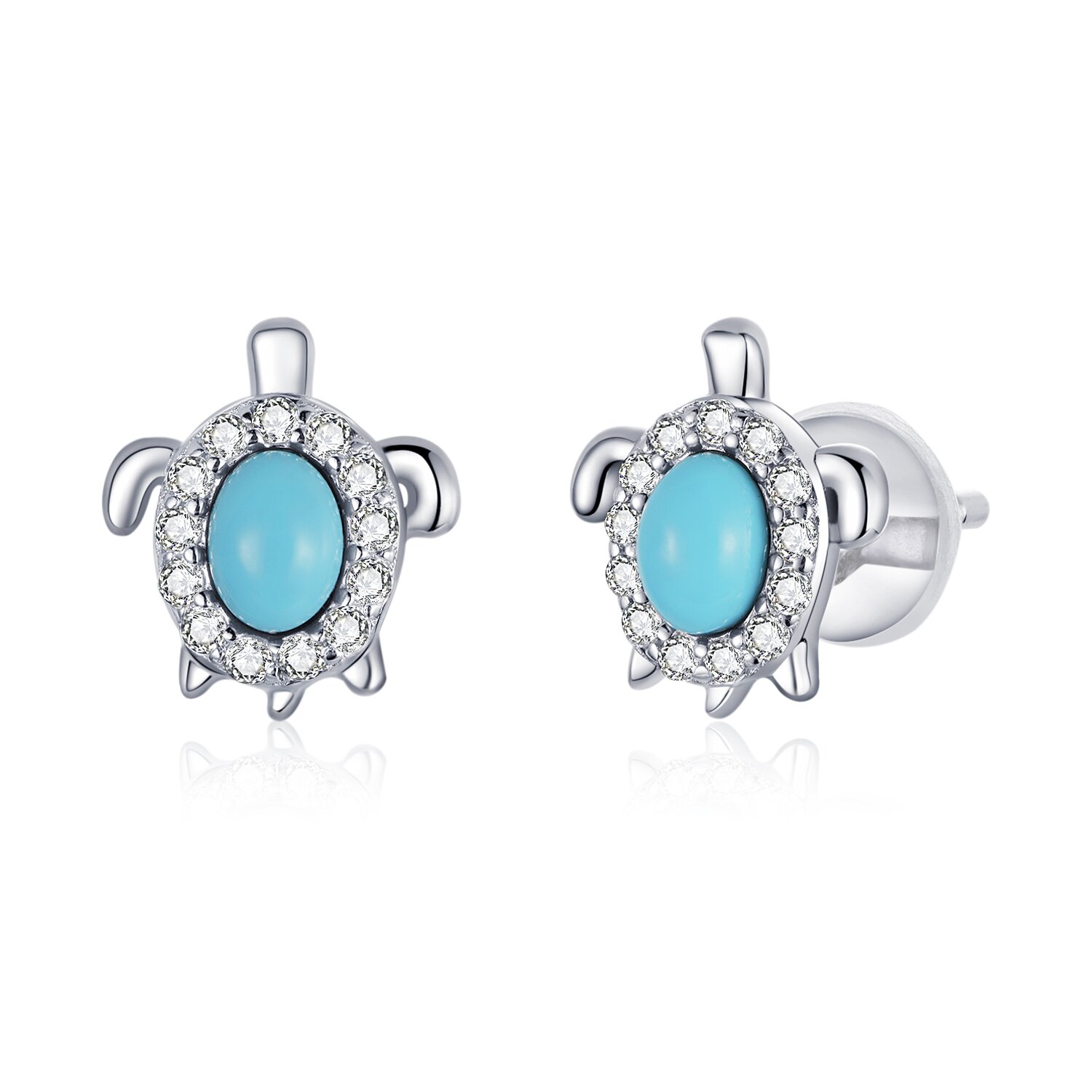 Cercei din argint Turquoise Turtle. Mărimi Material: Argint 925 Placaj: Rodiu Inchidere: Tija si fluturas Dimensiune cercei: 9.1 X 7.97 mm Piatra: Zirconiu