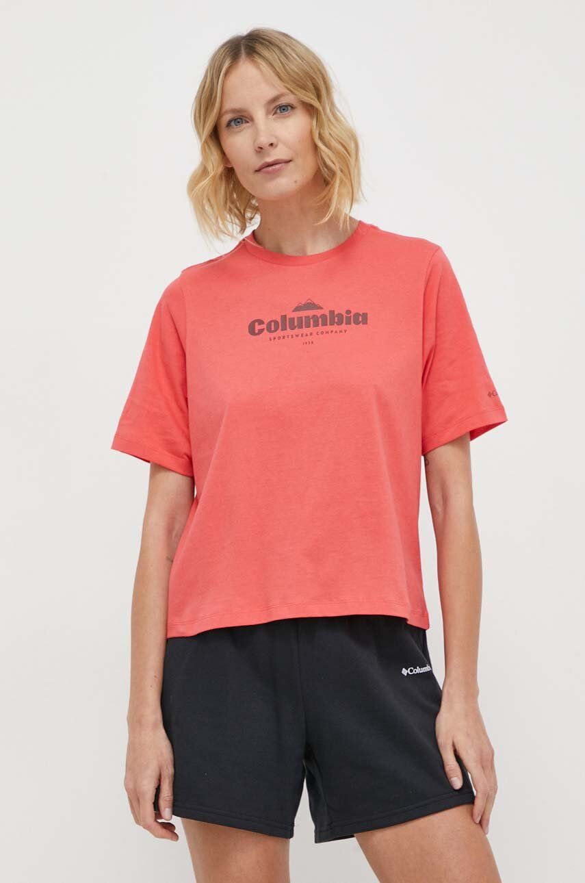 Columbia tricou din bumbac North Cascades culoarea rosu 1992085. Tricou din colectia Columbia. Model confectionat din tesatura elastica. Material foarte confortabil. – Taiere simpla, fara blocare. – Maneca scurta. – Decolteu clasic, rotund. – Material tricot flexibil si subtire. – Model cu imprimeu. – Spatele mai lung. – Lungimea in fata: 60 cm. – Lungimea in spate: 63 cm. – Latimea la subrat: 51 cm. – Dimensiunil