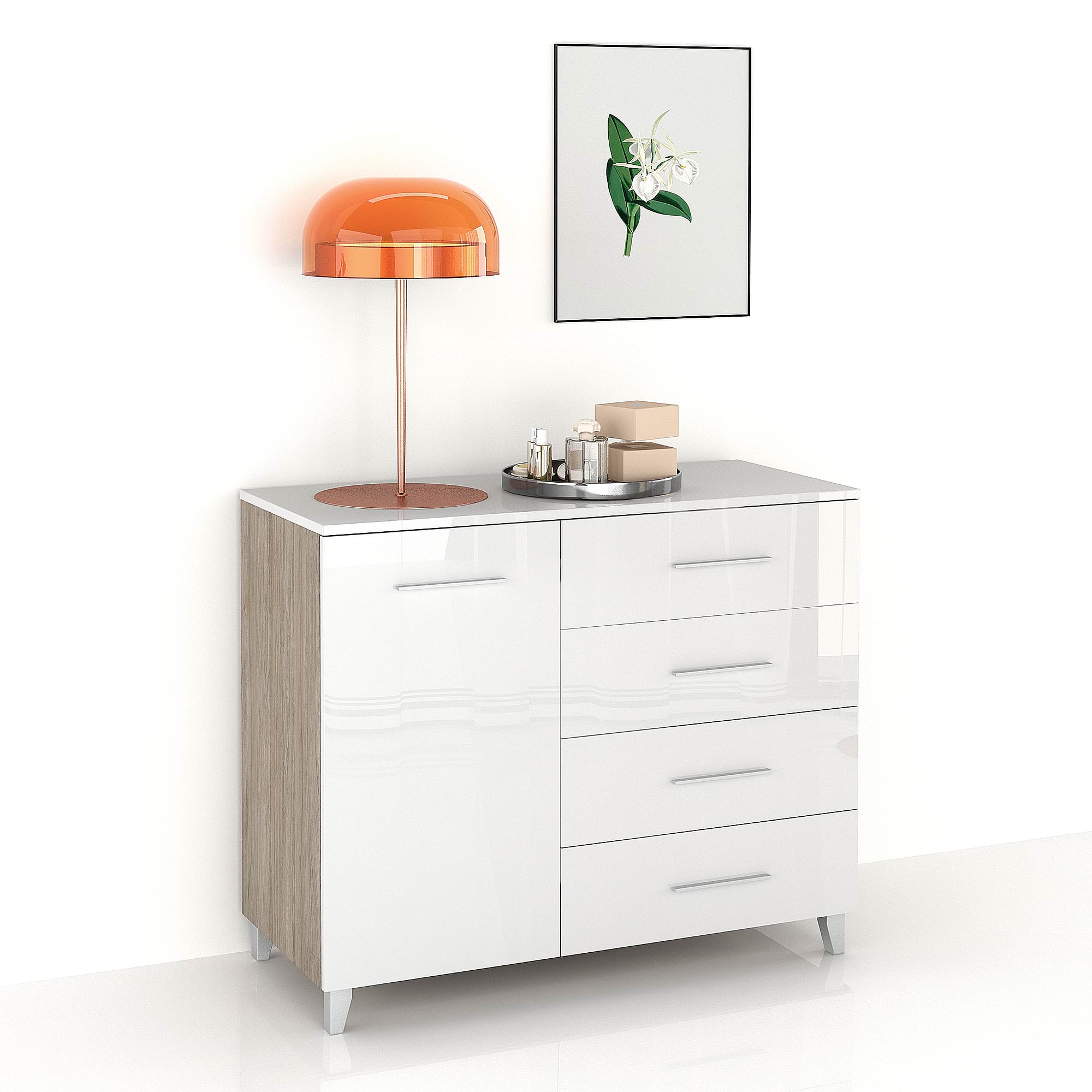 Comoda MATERA 105, 1U4S, Oak, Alb Gloss.Descopera cele mai bune oferte la mobilier pentru casa ta! De la canapele confortabile si paturi elegante pana la mese moderne si dulapuri spatioase, avem tot ce iti trebuie pentru un camin perfect. Alege stilul care ti se potriveste si bucura-te de calitate la preturi avantajoase!