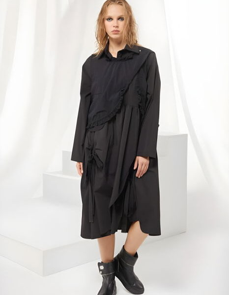 Set rochie neagra oversize cu guler tip camasa si vesta cu volanas