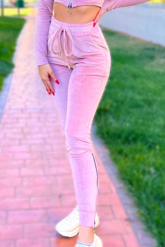 Compleu de catifea Paula, pantaloni si bluza pe gat cu fermoar, Roz, Marime S/M