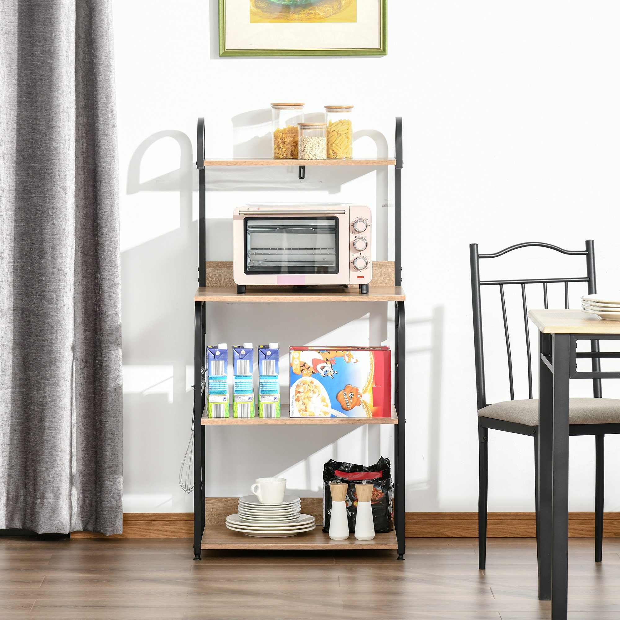Dulap cu rafturi pentru bucatarie, etajera, mobilier pentru bucatarie 60x40x125 cm. 4 RAFTURI: HomCom dulap cu rafturi pentru bucatarie, 60x40x125 cm este foarte spatios pentru depozitarea electrocasnicelor de bucatarie, a condimentelor, ustensilelor etc. Dulapiorul este ideal si pentru bucatariile de dimensiuni mai mici.CARLIGE SUPLIME dulapior pentru cuptorul cu microunde, 60x40x125 cm ideal de integrat in bucatariile de dimensiuni mai mici. Este dotat cu 4 rafturi pentru a putea aseza electrocasnicele, condimentele, ustensilele etc. Are de asemenea si carlige suplimentare. dulapior pentru cuptorul cu microunde, 60x40x125 cm dotat cu un sistem antirasturnare ce poate fi prins de perete pentru o mai mare stabilitate si siguranta. Realizat de asemenea din materiale de calitate pentru a fi rezistent in timp.