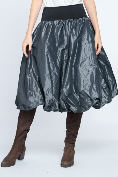 Fusta gri metalizat, tip gogosar, din tafta. Are buzunare laterale ascunse. In talie are o banda de licra elastica, ce o face potrivita pentru mai multe marimi. Are talie unica si se potriveste pentru marimile: M,L,XL,XXL Material: amestec de vascoza si poliester Dimensiun: talie 70-100 cm, lungime…