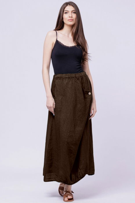 Fusta larga din in cu un colt prins, maron inchis. Are o banda elastica in talie Are un colt pe fata ce se prinde cu un nasture din lemn, se creeaza astfel un efect de fald La baza, pe tiv, in fata si in spate, are elastic pentru a strange putin Buzunare laterale Material: in (100%) Este…