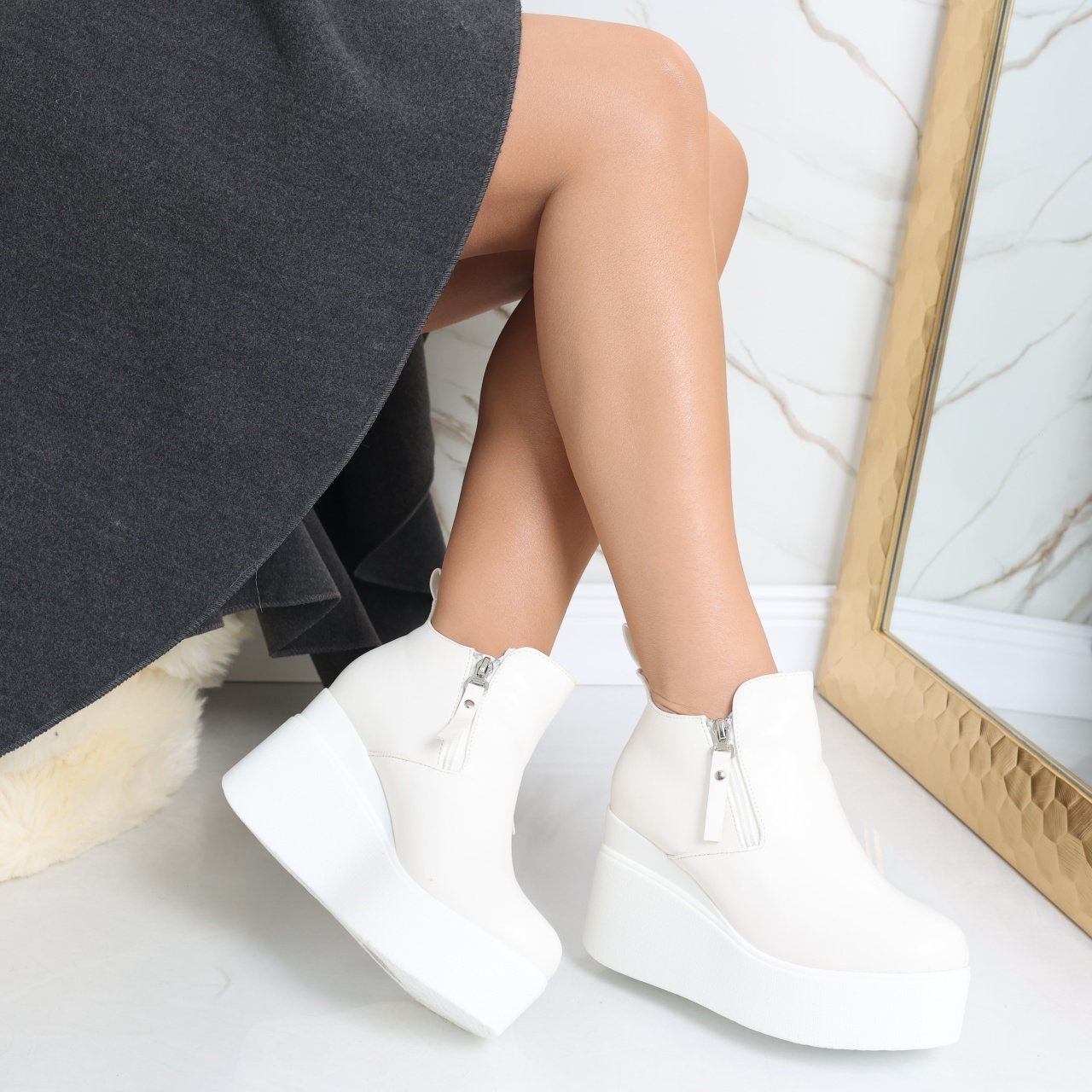 Ghete Dama Imblanite Albe din Piele Ecologica Jesia.Ghete pentru dama din piele ecologica intoarsa, perfecte pentru un look modern si sofisticat. Cu un design versatil si o textura placuta la atingere, aceste ghete iti completeaza tinuta atat la evenimente casual, cat si la ocazii elegante, asigurand confortul de care ai nevoie in fiecare zi.