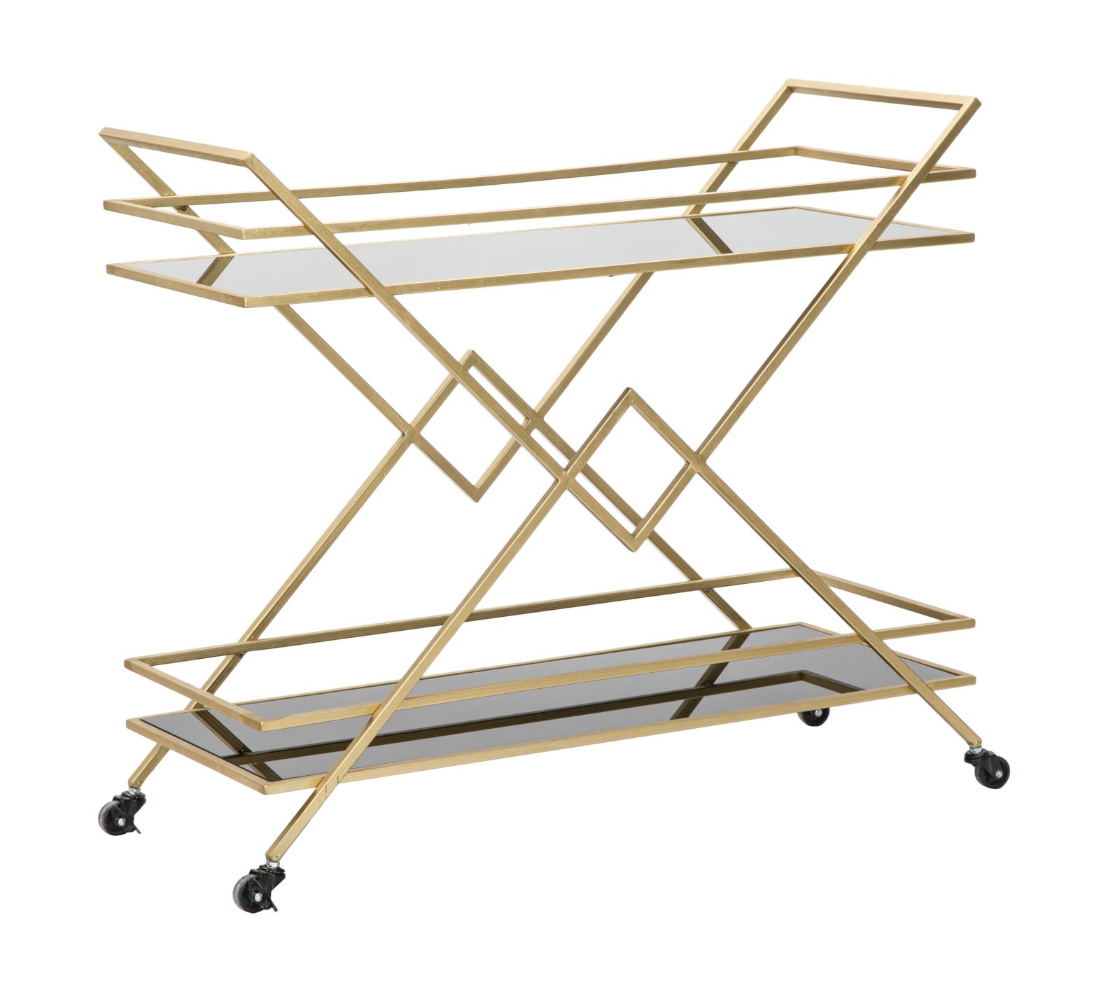 Mauro Ferretti CARUCIOR GLAM PYRAMID CM 90X40X80. Carucior dreptunghiular din metal auriu si sticla temperata neagra cu 2 rafturi si roti practice. Contrastul dintre negru si auriu ofera o nota de clasa oricarei ambiante glam. Liniile geometrice se imbina perfect cu orice tip de mobilier. Carucior dreptunghiular din metal auriu si sticla temperata neagra cu 2 rafturi si roti practice. Contrastul dintre negru si auriu ofera o nota de clasa oricarei ambiante glam. Liniile geometrice se imbina perfect cu orice tip de mobilier.