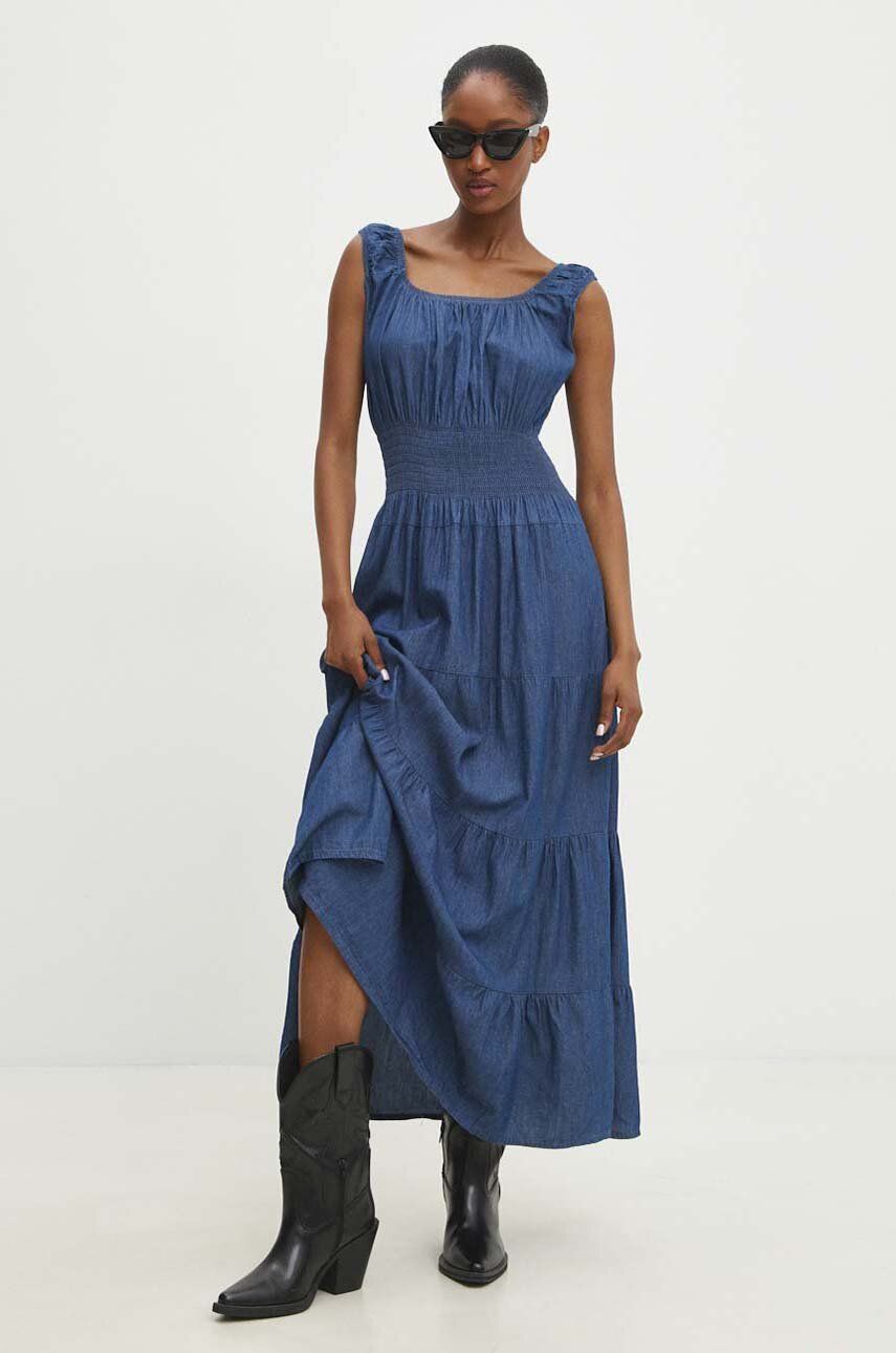 Model Nou de rochie in bumbac maxi, evazati. Rochie subtire in colectiainswear Lab infectinat in tesaturineteda. Model in material aerisit, bumbac. – Fainin clos. – Decolteu clasic, roind. -in talie inda larga, elastica. – Stofa subtire,inflexibila. – ingimea: 137 cm. – Latimea la subrat: 44 cm. – Latimea taliei: 23 cm. – Diinsitile date intru marimea: S/M.