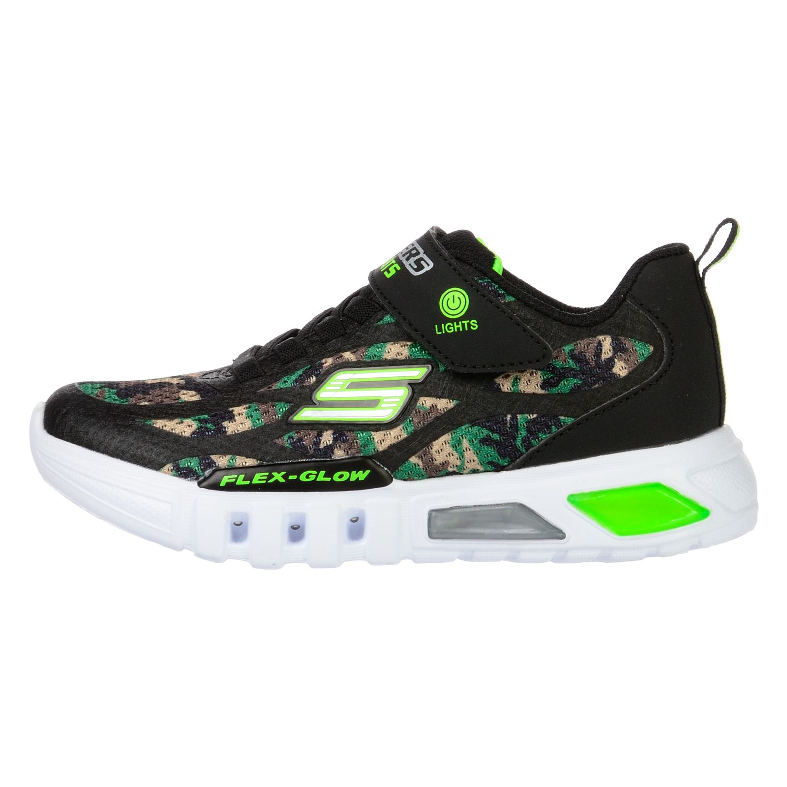 Pantofi sport SKECHERS pentru copii FLEX-GLOW – RONDLER – 400017LCAMO. Baiatul tau va fi super-incantat de luminite culori si camuflaj adica de pantofii sport Skechers pentru copiiÿFLEX-GLOW – RONDLER!- Exterior din mesh usor. – Sireturi elastice. – Baretaÿcu velcro cu buton de pornire/oprire a luminitelor. – Brantÿconfortabil. – Talpaÿintermediaraÿusoara ce amortizeaza socurile. – Luminite la nivelul talpii intermediare. – Talpaÿexterioaraÿflexibila aderentaÿsi care nu lasa urme.