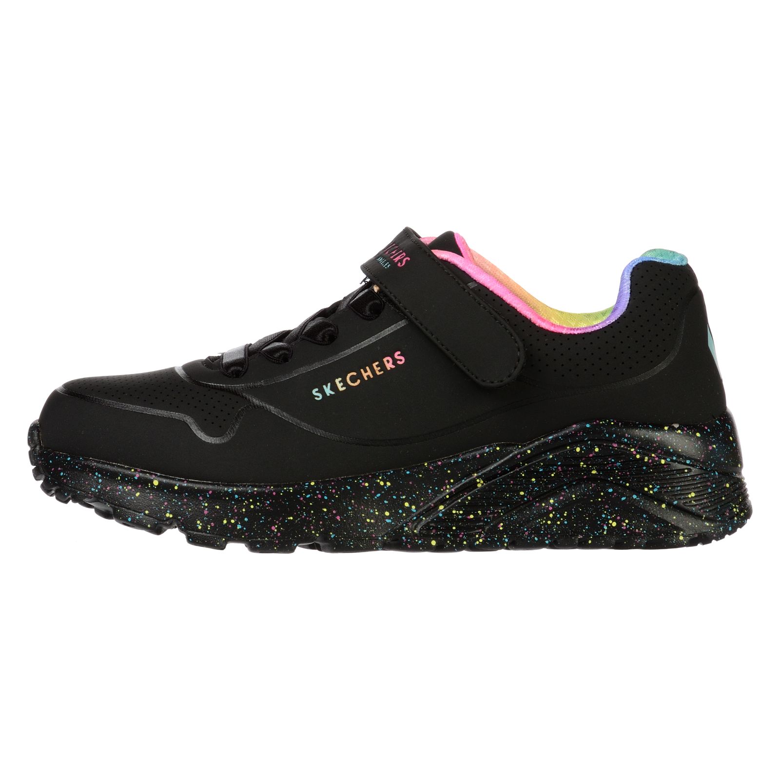 Pantofi sport SKECHERS pentru copii UNO LITE-RAINBOW SPECKS – 310457LBKMT. Pantofii sport Skechers pentru copii UNO LITE-RAINBOW SPECKS au un design cu pete multicolore care exprima bucurie. – Exterior din material sintetic cu perforatii. – Sireturi elastice. – Bareta cu velcro. – Brant confortabil cu spuma cu memorie. – Talpa intermediara cu design cu pete multicolore. – Talpa exterioara flexibila si aderenta.