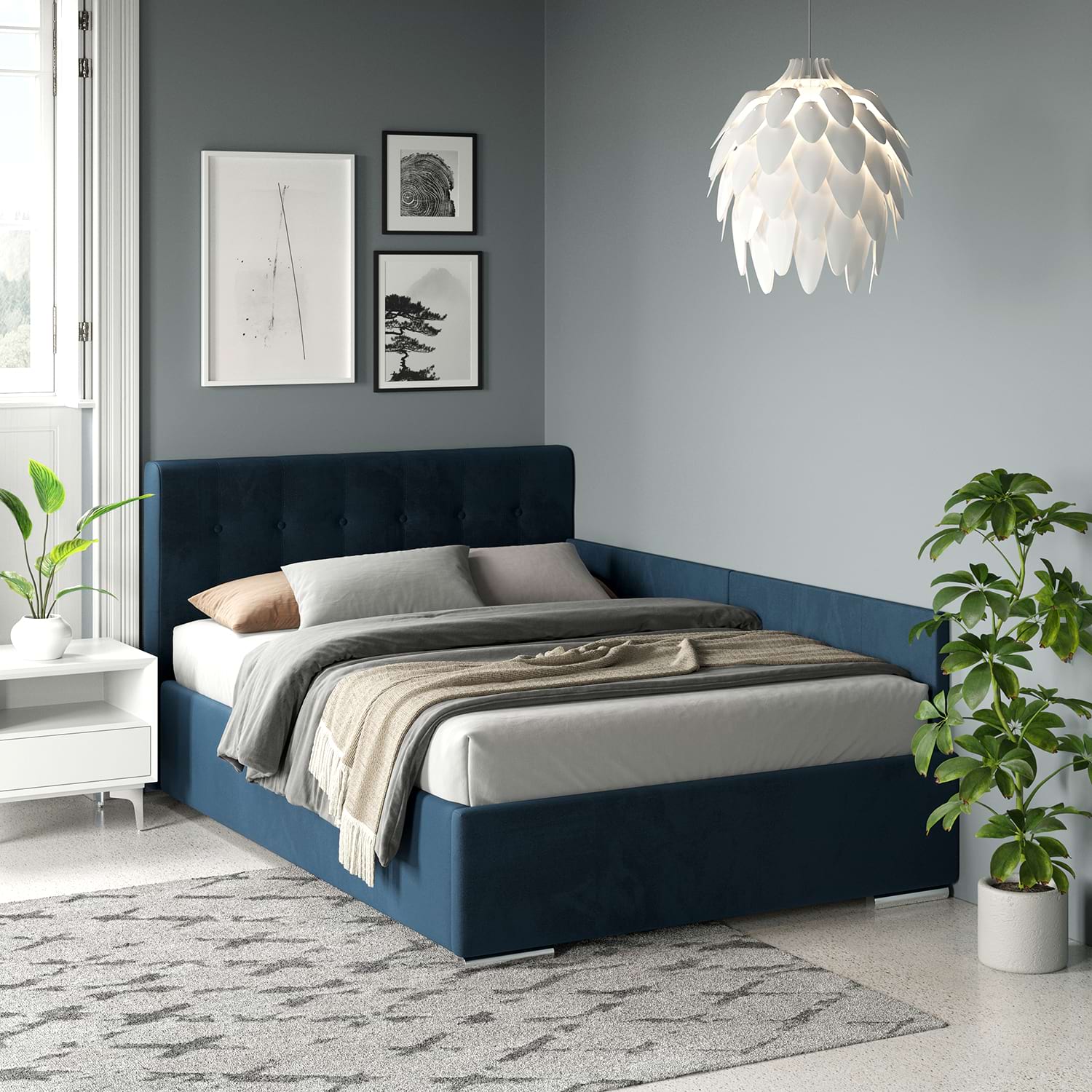 Pat colt tapitat GEORGIA Clasic, 160×200, H107, somiera, catifea Albastru. Patul de colt tapitat GEORGIA Clasic, 160×200, H107 cu somiera rabatabila si lada depozitare, husat cu catifea Albastru are un design modern si robust. Tablia patului este un element distinctiv, formata din patrate tapitate care adauga un efect vizual interesant si un plus de confort.Patul dispune de o somiera rabatabila, oferind spatiu de depozitare dedesubt. Solutia de colt e asigurata cu Kit laterale tapitate pat – din 2 placi tapitate, cu prindere pe perete (INCLUS) sau cu prindere pe laterala patului cu sisteme metalice (OPTIONAL-Contra cost)Exclusiv PROFESIONISTI! Pret de producator , livrare rapida si Gratuita ! Configurabilconfigurezi husa (piele ecologica, piele texturata, catifea, stofa)configurezi dimensiune pat – 140cm, 160cm, 180cmconfigurezi complemente – asezare pe coltul camerei, saltele, noptiere, comode, dulapuri AvantajeCONFORT – Combinand armonios rigoarea geometrica a tabliei cu formele arcuite pe care le creaza buretele folosit din belsug, patul Georgia da nastere unui stil personal si cald.Incadrandu-se cu succes in orice stil de amenajare, realizeaza combinatii valoroase cu mobilierul din lemn, furniruri sau placaje.FUNCTIONALITATE – Patul tapitat Georgia Clasic contine o somiera metalica ranfortata, compusa din lamele arcuite din fag, montate pe un cadru metalic foarte solid. Sistemul de ridicare compus din balamale si amortizoare cu gaz vin sa completeze fiabilitatea suportului de saltea. Compartimentul de depozitare generos si complet tapitat iti va organiza si iti va sistematiza spatiul din dormitor.REZISTENTA – Pentru o rezistenta fara cusur, am proiectat pentru patul Georgia Clasic un sistem metalic ce sustine fundurile de pat distantate de sol si rigidizeaza cadrul patului. In plus, o bara de rigidizare metalica dispusa transversal sprijina somiera in starea de repaus si impiedica deformarea lateralelor patului in timp. Sistemul permite o aerisire corecta a saltelei si a lucrurilor ce se depoziteaza in lada patului.Mobilier kit, se livreaza demontat, ambalat in cutii de cartonKitul contine schita montaj, feronerie, certificat garantie si conformitateSomiera metalica cu lamele arcuite din fagPistoane cu gaz (amortizoare)Spatiu depozitare sub somiera cu structura metalica, distanta de pardoseala si suport depozitare tapitat integralKit laterale tapitate pat – din 2 placi tapitate, cu prindere pe perete (INCLUS) sau cu prindere pe laterala patului cu sisteme metalice (OPTIONAL-Contra cost)Picioare cromateCusaturi de tapiterie cu banda de intarire Dimensiuni pat Georgia Clasic 160x200cmDimensiuni interioare: 161x201cmDimensiuni exterioare: 170x217cmInaltime tablie mare: 107cmInaltime cadru pat: 37cmInaltime de la sol: 4cmPlaca tapitata H = 36cm Texturi / culori disponibilecatifea Albastru Garantie 24 luni Livrare Gratuita. Manipularea produsului nu este inclusa, produsul se preia de la masina. *NOTA* Imaginile afisate sunt doar pentru scopuri ilustrative. Dimensiunile reale ale produsului pot diferi usor fata de cele prezentate. De asemenea, culorile pot varia in functie de setarile dispozitivului dvs. Va rugam sa verificati specificatiile produsului pentru detalii exacte si sa va asigurati ca este decorul dorit.*Noptiera, salteaua de pat, lenjeria si celelalte acesorii din imagine nu sunt incluse in pret….