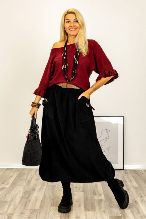 Pulover cu maneci scurte si volane la mansete din vascoza, bordo