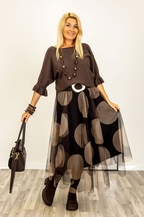 Pulover cu maneci scurte si volane la mansete din vascoza, maro