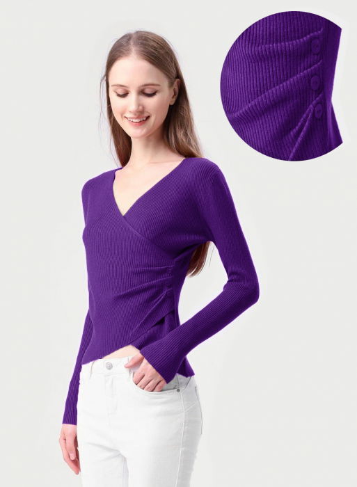 Pulover mov cu striatii, cu bust petrecut in V si nasturei pe-o parte. Are maneci lungi si decolteu in V Are pe o parte nasurei decorativi Material: 50% vascoza, 30%poliester, 20% poliamida. Materialul este extensibil. Descriere dimensiuni, fara a fi intins materialul: S M: umeri 33 cm, bust 81 cm, lungime…