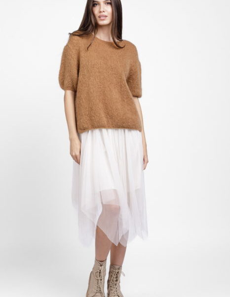 Pulover reversibil camel, oversize cu funda si maneca fluture