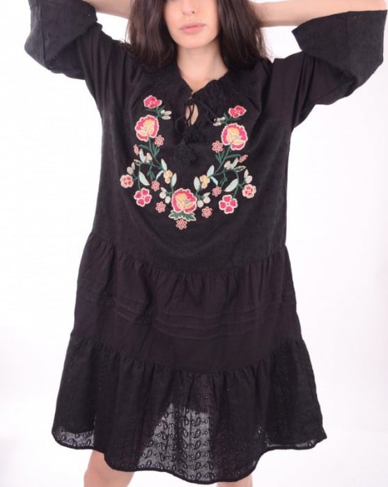 Rochie brodata Tara 11. Rochie neagra cu motive traditionale, croi drept, cu maneci trei sferturi stil clopot, decolteu rotund, accesorizata in zona din fata. Este prevazuta cu jupa.