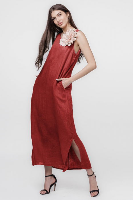 Rochie lunga A-line din in, fara maneci, rosiatic inchis