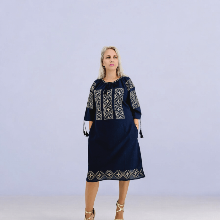 Rochie Traditionala Elodia 5 – masuri mari. Rochie bleumarin cu broderie, cu motive florale de culoare negru inspirate din folcor. Material panza de bumbac si prevazuta cu dublura. Maneci 3 4 (ajustabile) si decolteu rotund.