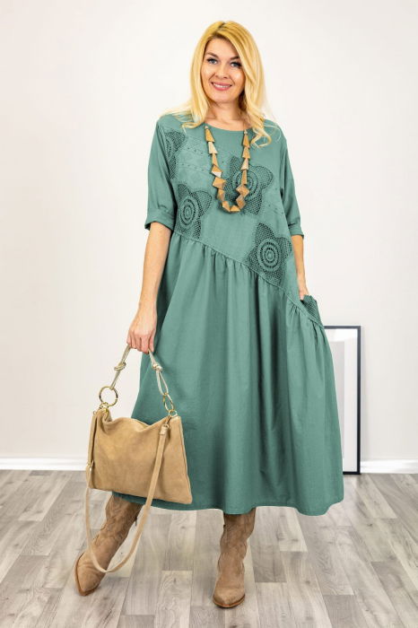 Rochie turcoaz prafuit cu taietura oblica si broderie, din poplin si jerseu, oversize