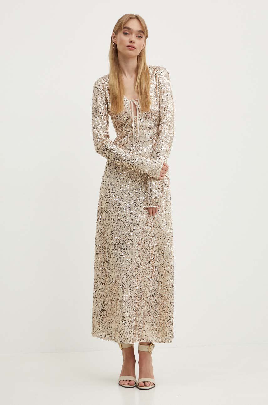Rotate rochie culoarea maro, maxi, evazati. Rochie in colectia Rotate infectinat in material cu paiete.in model spectaculos intru octii speciale. – Acest produs este realizat partial in poliester reciclat. – Fainin clos. – ineca inga. – Decolteu decorativ, in V. – Cravata decorativa la decolteu. – Model cu captuseala. – inchiderea laterala ininabila cu fermoar ??l face u??or de pus ??i s