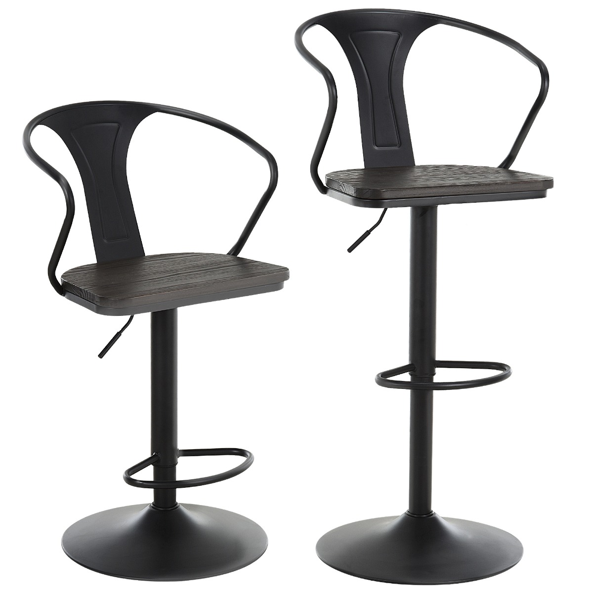 Set de 2 Scaune de Bar Moderne Scaun Pivotant Spatar Reglabil pe Inaltime din Lemn Metal 5 Roti Pivotante Robuste Negru. SET 2 PIESE: Acest set include doua scaune inalte ideale pentru crearea unei zone de bar in bucataria dvs. sau pentru decorarea biroului sau restaurantului. Datorita aspectului lor negru total, inspirat de stilul industrial, vor da un plus de eleganta me Doriti sa creati o zona de bar in camera dvs. de zi? Sau doriti sa adaugati o nota de eleganta cafenelei dvs.? Oricum ar fi, acest set de 2 scaune inalte de bar este solutia perfecta! Sunt pivotante si ergonomice, datorita unui spatar confortabil cu cotiere si suport pentru picioare. Structura este din otel si este echipata cu un scaun din lemn, pentru un confort mai mare. Aspectul sau negru total si designul de inspiratie industriala vor da caracter si stil casei sau afacerii dvs.!