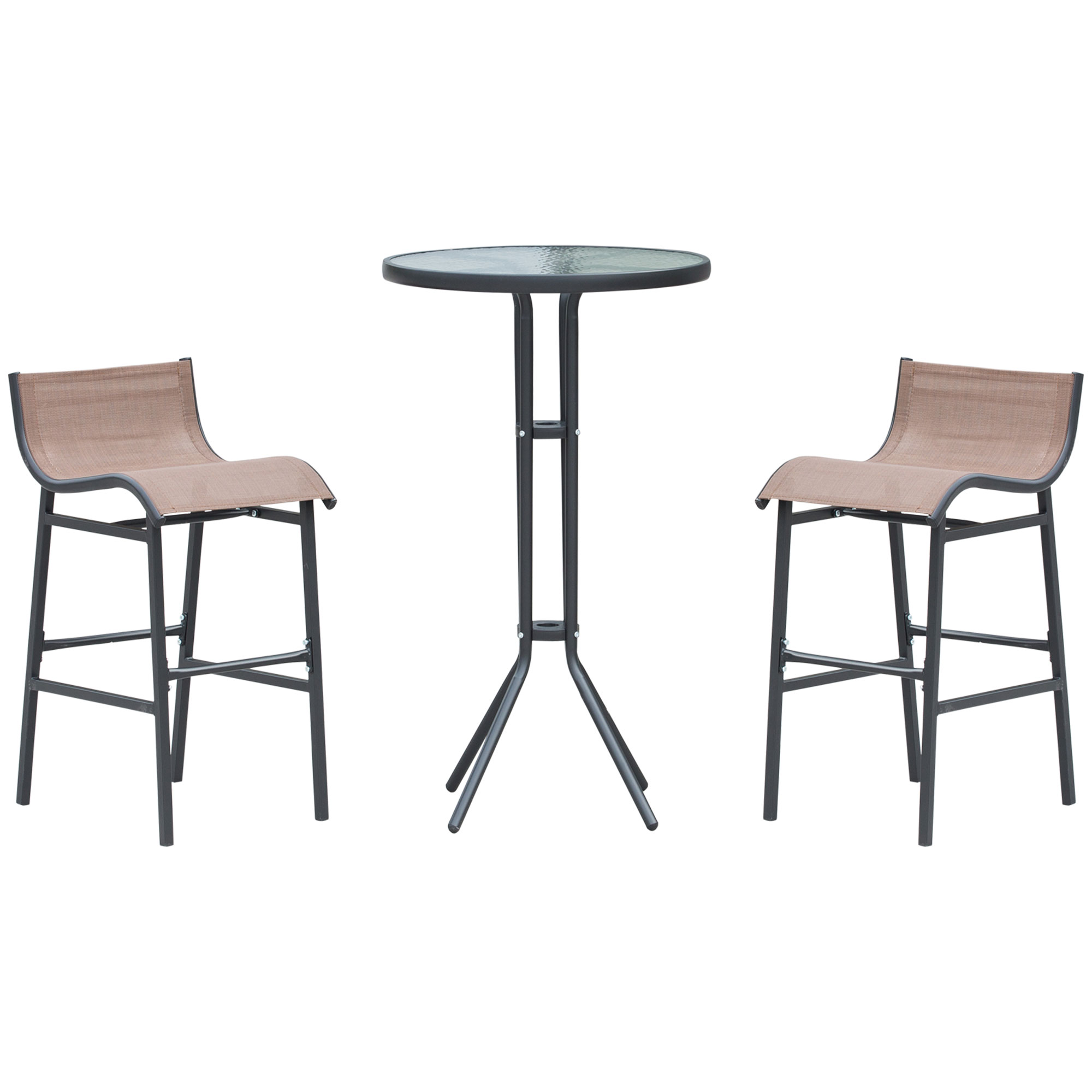 Set de Bar 2 Scaune cu Masa Inalt Negru si Maro. SET 3 PIESE: Acest set este perfect pentru a schimba aspectul barului! Include 2 scaune (40,5L x 50L x 82H cm) cu scaun din tesatura din plasa si o masa rotunda cu suprafata superioara temperata (??60x102H cm).IDEAL PENTRU SPATII MICI: Acest set este perf Bucurati-va de un aperitiv asezat la bar cu acest set fantastic din 3 piese, cu masa si scaune. Ideal pentru spatii mai mici, este perfect pentru medii la aer liber datorita utilizarii materialelor rezistente, impermeabile si antirugina. Masa circulara are o suprafata de sticla calita, iar cele doua scaune sunt echipate cu un scaun din tesatura din plasa. Schimbati aspectul barului sau bistroului si intampinati-va clientii cu acest set Outsunny!