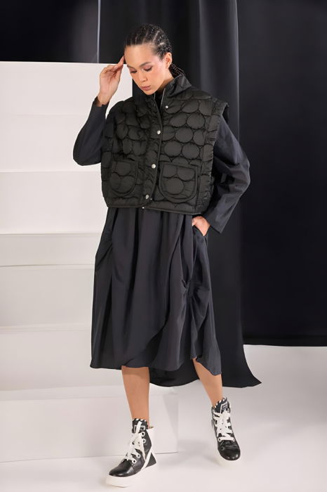 Set rochie neagra oversize cu guler tip camasa si vesta matlasata. Rochia are maneca lunga, este taiata si usor incretita in talie Are guler tip camasa cu nasturi pana in talie Are doua buzunare ascunse, laterale Partea din fata a rochiei este dublata si se petrece Vesta are buzunare aplicate pe fata, se inchide…