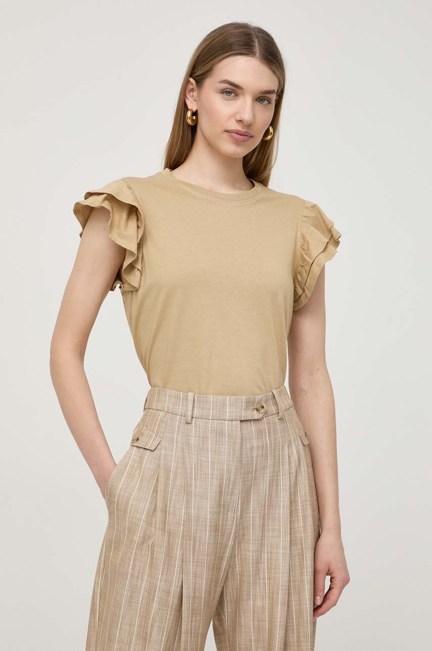 Silvian Heach tricou din bumbac culoarea bej. Tricou din colectia Silvian Heach confectionat din tesatura subtire, elastica. Model realizat din material bumbac extrem de confortabil. Dimensiunile disponibile sunt cele ale producatorul italian, raportate la dimensiunile europene standard. Marimea comandata poate diferi fata de cea inscriptionata pe eticheta (IT 38 / XXS = EU XS). Pentru a fi sigur, va rugam sa consultati tabelul cu marimi. – Taiere simpla, fara blocare. – Decolteu clasic, rotund. – Model cu maneci decorative. – Lungimea: 64 cm. – Latimea la subrat: 45 cm. – Dimensiunile date pentru marimea: S.