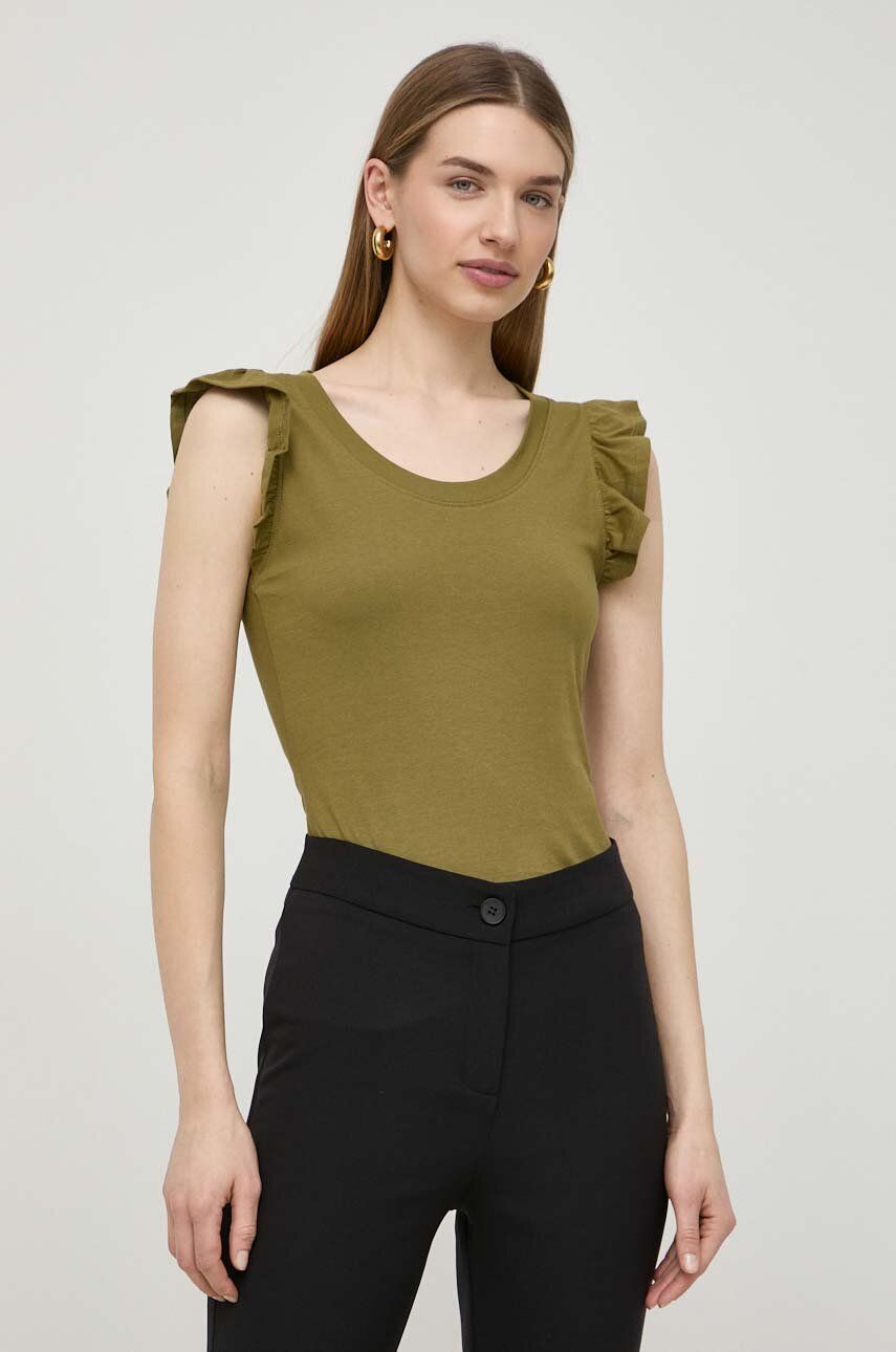 Silvian Heach tricou femei, culoarea verde. Tricou din colectia Silvian Heach confectionat din tesatura subtire, elastica. Model realizat din material bumbac extrem de confortabil. Dimensiunile disponibile sunt cele ale producatorul italian, raportate la dimensiunile europene standard. Marimea comandata poate diferi fata de cea inscriptionata pe eticheta (IT 38 / XXS = EU XS). Pentru a fi sigur, va rugam sa consultati tabelul cu marimi. – Taiere simpla, fara blocare. – Decolteu clasic, rotund. – Maneca scurta. – Model cu maneci decorative. – Lungimea: 56 cm. – Latimea la subrat: 40 cm. – Dimensiunile date pentru marimea: S.
