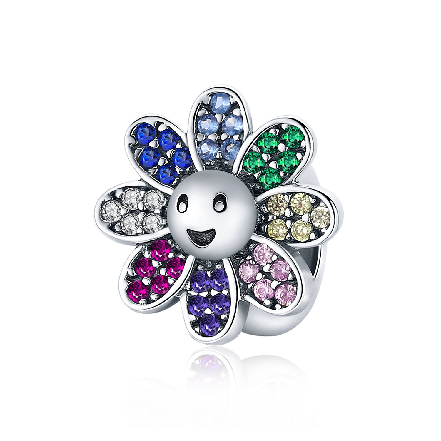 Talisman din argint Colorful Sunflower. Material: Argint 925 Placaj: Rodiu Diametru: L=l ; 11mm x 11mm Grosime: 3mm Greutate aprox: 1.88g Tip talisman: Charm Pietre: Zirconiu