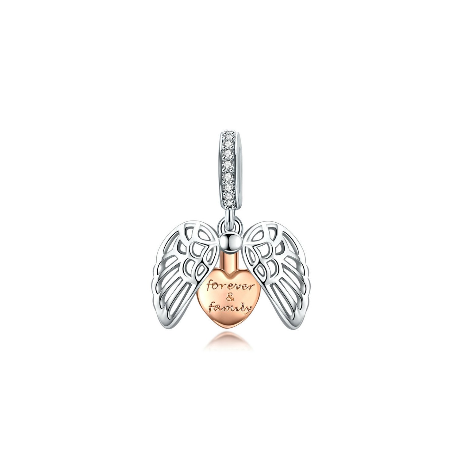 Talisman din argint Family in my Heart. Material: Argint 925 Placaj: Rodiu/ Aur Rose 18K Dimensiune element: 12.86 x 11.72 mm Tip talisman: Pandantiv Pietre: Zirconiu