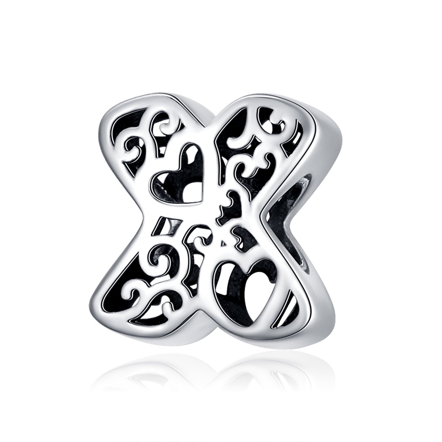 Talisman din argint In Love with Letter X. Mărimi Material: Argint 925 Placaj: Rodiu Dimensiuni: L x l x g= 11mm x 11mm x 8mm Greutate aprox: 2.14g Tip talisman: Charm Pietre: Fara pietre