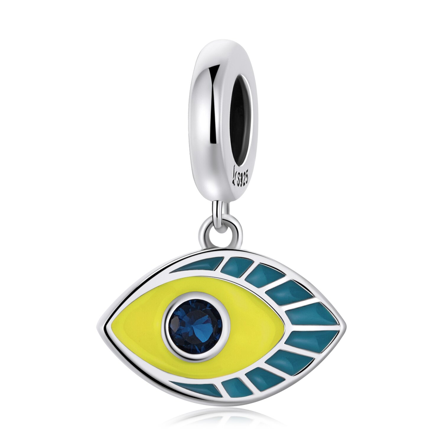 Talisman din argint Mystery Eye. Mărimi Material: Argint 925 Placaj: Rodiu/ Email Dimensiune element: L x l x g= 10mm x 14mm x 3mm Greutate aprox: 1.83g Tip talisman: Pandantiv Pietre: Zirconiu