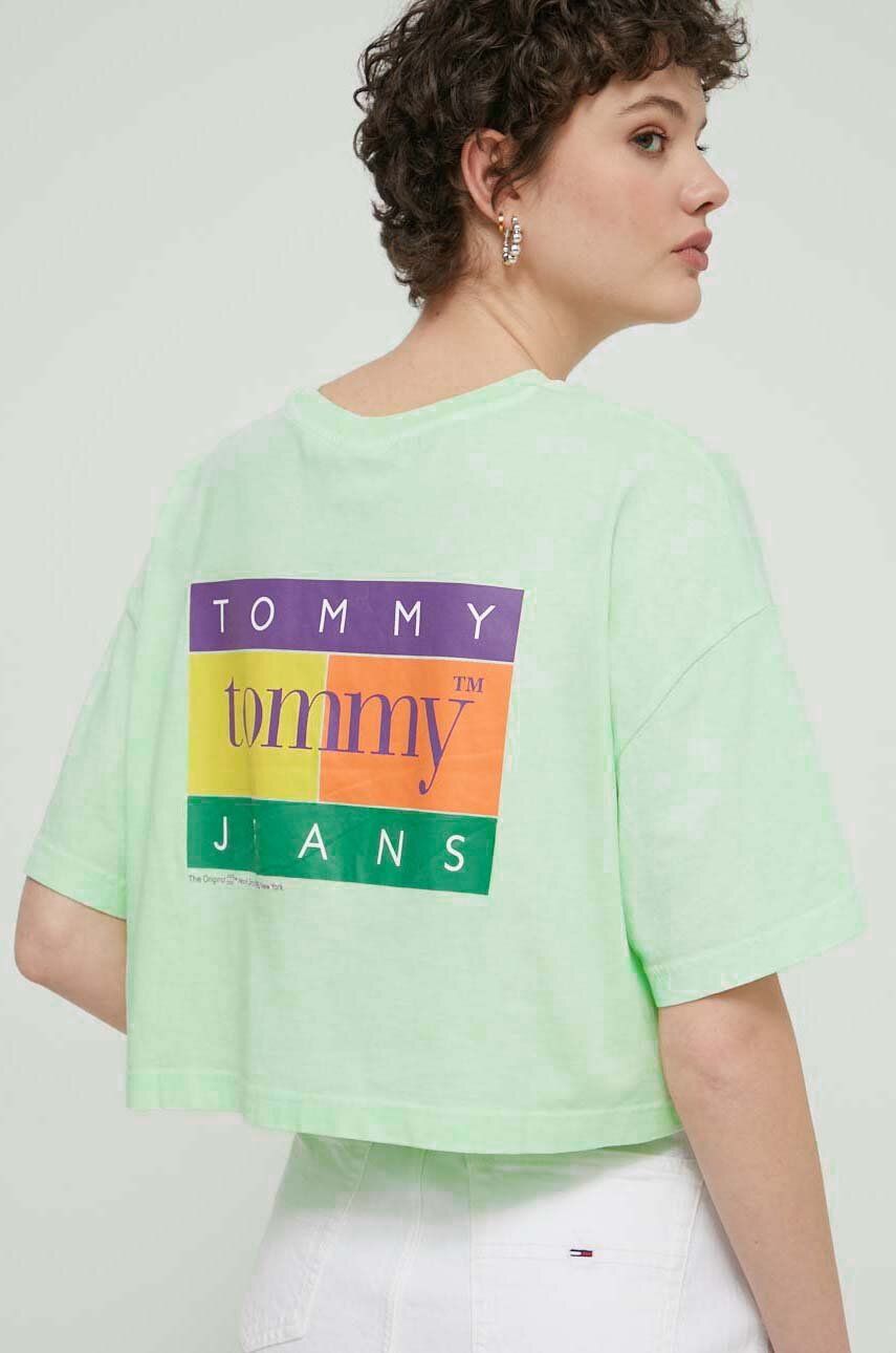Tommy Jeans tricou din bumbac femei, culoarea verde, DW0DW18141. Tricou din colectia Tommy Jeans confectionat din tricot cu imprimeu. Model din material aerisit, bumbac. – Bumbacul procesat in mod durabil reduce impactul asupra mediului prin reducerea utilizarii substantelor chimice si economisirea apei si a energiei, imbunatatirea conditiilor de viata si dezvoltarea economica a regiunilor producatoare de bumbac. – Croial