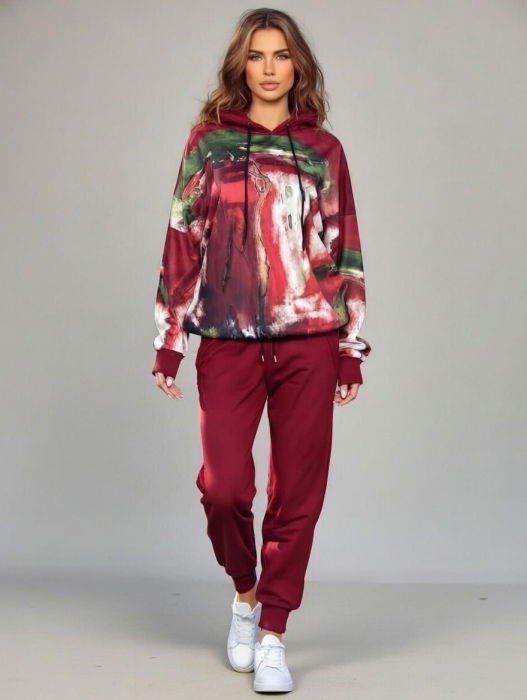 Trening dama din catifea cu hanorac imprimat si pantaloni jogger , bordo