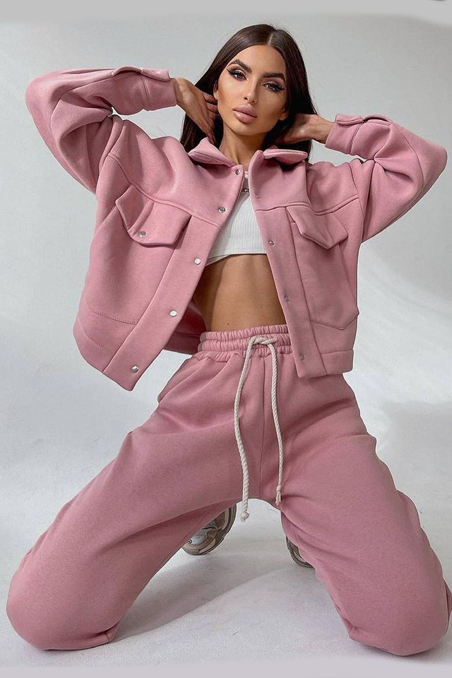 Trening vatuit dama, Arina, pantaloni lejeri si bluza cu capse, Roz pudra