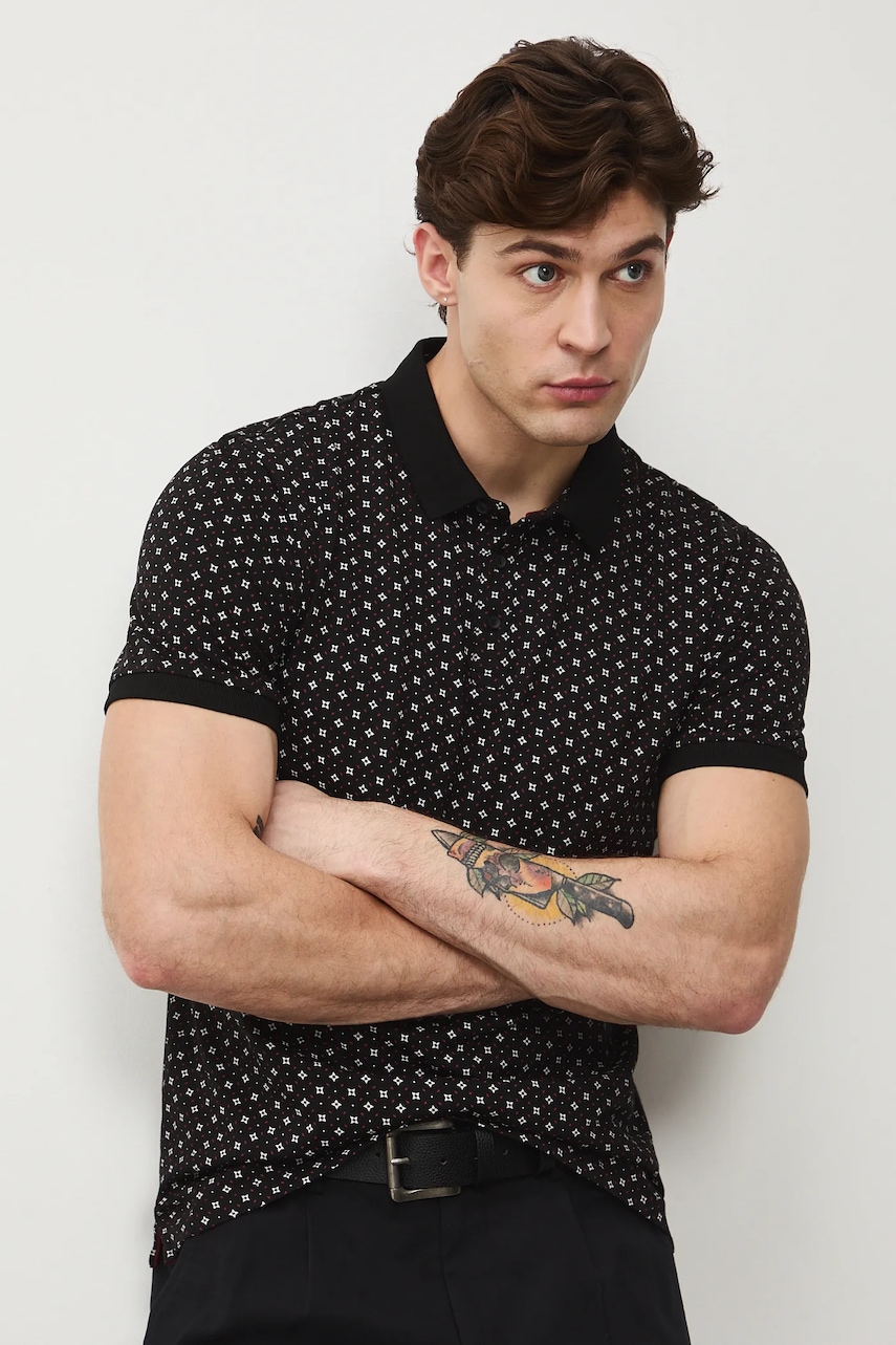 Medicine tricou polo. – Fason slim. – Maneca scurta. – Model cu guler. – Incheiere scurta cu nasturi. – Țesătură tricotată cu un model mic. – Lungimea: 71 cm. – Latimea pieptului: 51,5 cm. – Dimensiunile date pentru marimea: M.