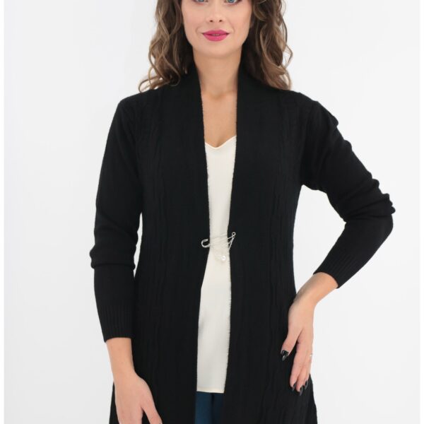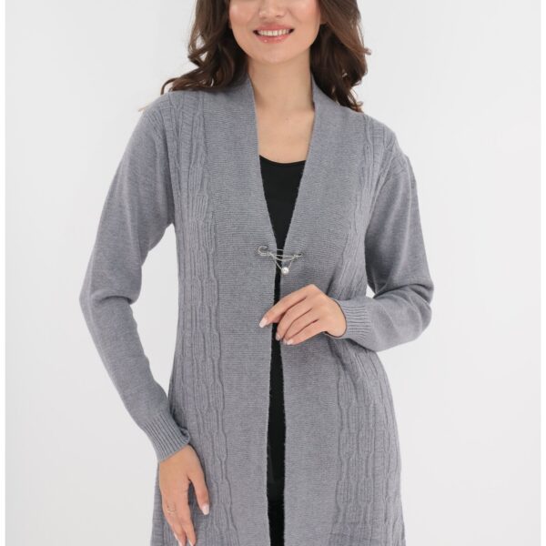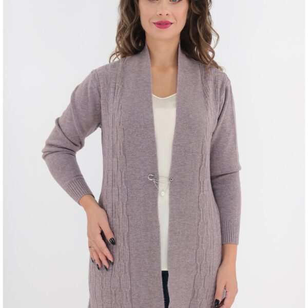 Cardigan cafeniu tricotat cu model in relief si brosa