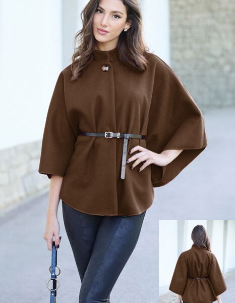 Jacheta trendy stil poncho cu curea, din stofa maro ciocolata