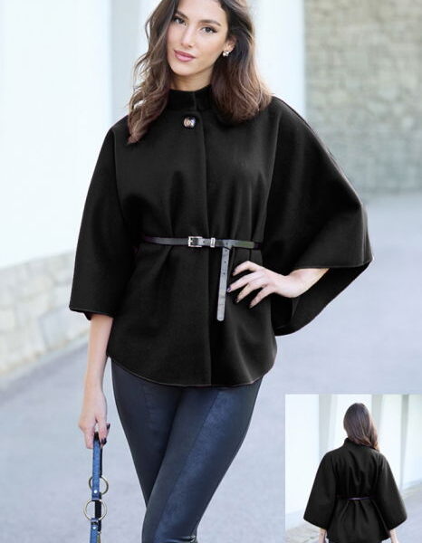 Jacheta trendy stil poncho cu curea, din stofa neagra